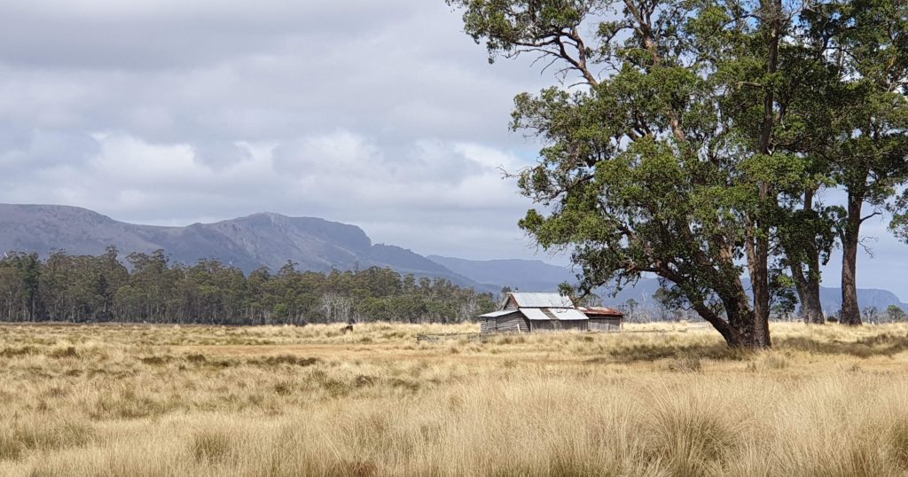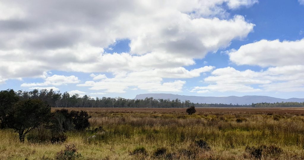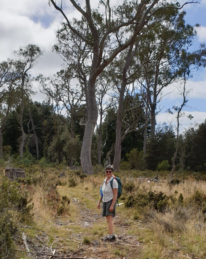 Today was a fun day in perfect weather. We walked this section in reverse as it was easier to have our gourmet lunch at the hut which has some (AWD) road access. There were great views of the Great Western Tiers. Western Bluff, Fisher Bluff and Turrana Bluff dominate the landscape above the open grazing plains and we could see up the valley to Clumner Bluff near the Walls of Jerusalem.