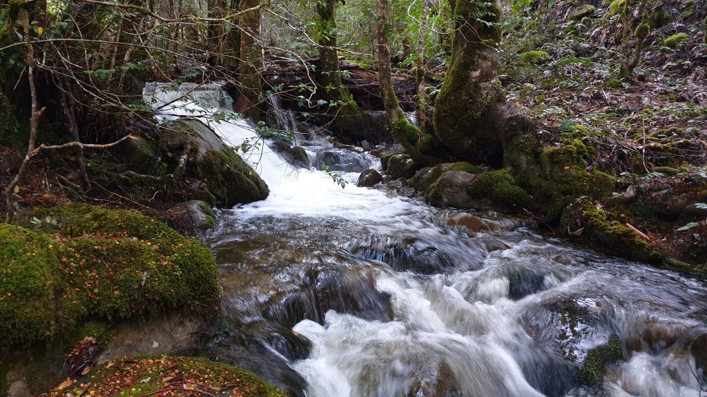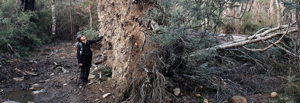 We were pleasantly surprised. The old forestry tracks made walking easy, and we strode out faster than we had been walking. Special moments included slipping off the track to enjoy rainforest alongside a gushing creek, and our glimpses of Clumner Bluff.