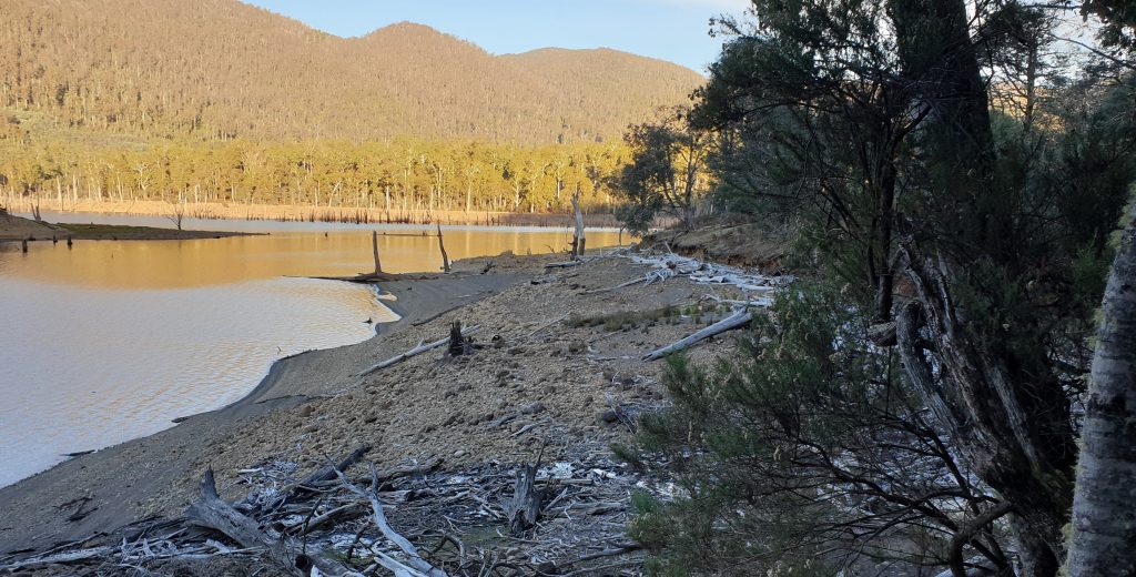 Tim had checked the maps and predicted that it would be possible to scrub bash between two old tracks west of Lake Rowallan, and it was. In beautiful afternoon light, we walked beside the lake, skirting large puddles on the now disused track. Tim pointed out the spot where 30 years ago, he and a friend Andrew were badly bogged and had to dig out our old Subaru!