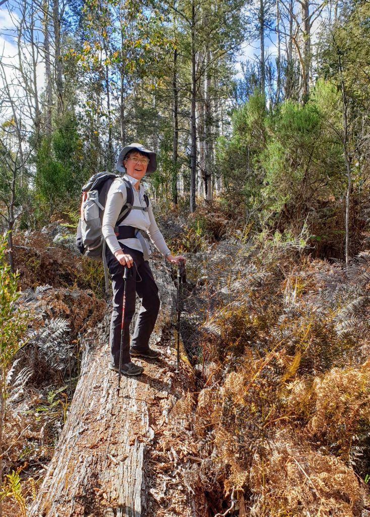 The falls are magnificent. From there, though, I was in Tim’s hands. His reputation as Mr GPS was sustained throughout the day, as we had to find links between various forestry tracks that did not connect. Crossing the creek, then bush-bashing up the hill we came up directly onto a track we had scouted on the way to breakfast. When we crossed the Lyell Highway I again followed Tim who was confident we could scramble through bush to find the road we needed, and sure enough, though he led us to a marshy area, we came directly to a ready-made bridge, i.e. log, where we could easily cross.
