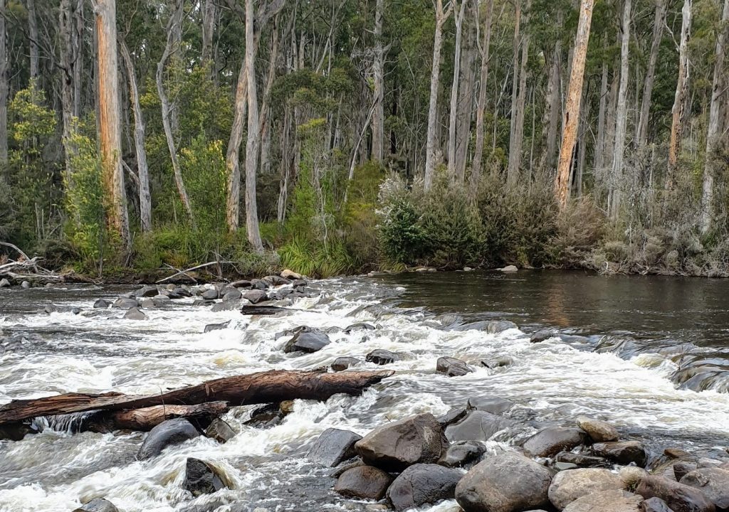 Back at the Wayatinah Tavern, we met proprietors Steve and Merrin (It made my day, meeting Merrin. We Merrans do not often meet other Merrins). When Tim explained our predicament, Steve called up one of his fishing mates, and he and his dog came by the campground to suggest one of the only places we might be able to safely cross, below a weir a further 500m downstream from the absent bridge. We completed the day’s walk in the evening, another 8 km along a mostly unused road, then followed the directions to the weir. We found it easily, and stood there gazing out at the racing water spilling over smooth boulders. I was starting to steel myself for a crossing that seemed rather too challenging for me when Tim declared we would have to give it a miss for being too dangerous under the present conditions. It was a difficult decision, as it means we may end up crossing most of Tasmania, but for the 40 metre width of the Florentine River. Still, we are not up to taking unnecessary risks, and this was definitely the right call to make.