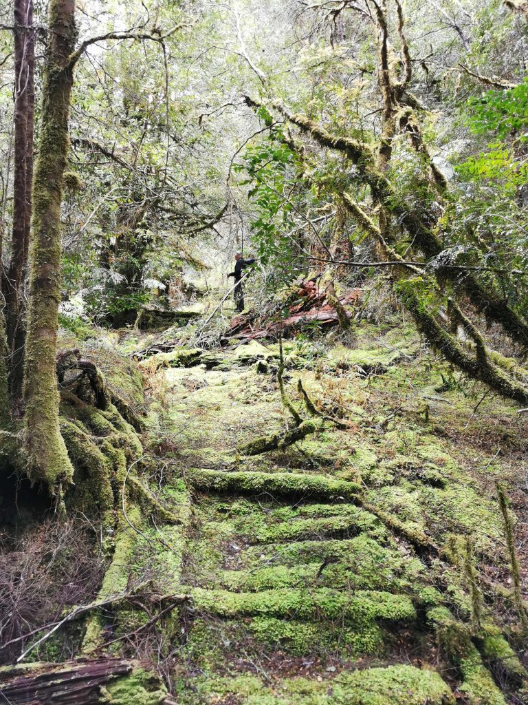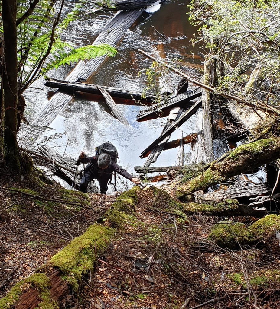 It was not long before we needed to employ all our navigation skills working our way through the forest where apparently tracks had once been. Beer bottles and ceramic insulators used for telegraph wires became welcome markers for us, as well as logs over rivers. The clearest sections were the mossy remnants of the trolley way that Tim’s father Alan had traveled along in the 1940s when he and a group of friends rode their bikes to Adamsfield.