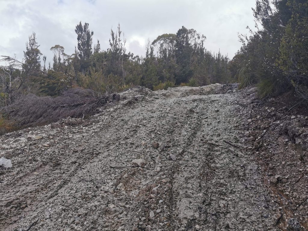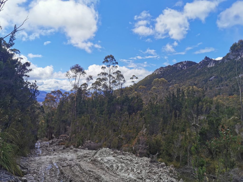 The section through to Adamsfield was challenging due to the difficulty navigating. The Sawback Track, the final half of our day was a series of ever steeper and longer roller-coaster sections of silvery mud. It was supposed to be a 4WD track, but we have no idea how any vehicle could traverse it.