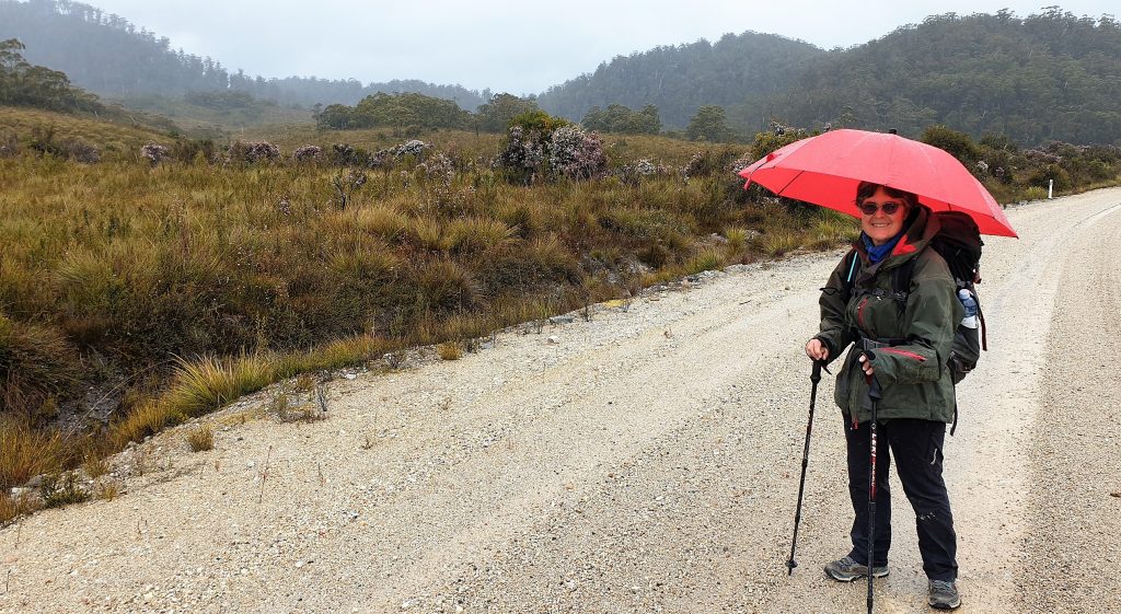 We had a slower start this morning, leaving Maydena about 7:30 am and a long car shuffle, so it was around 9:20 am when we began the day’s walking with a gentle climb from the Gordon Road before a long downhill run toward Lake Pedder. The walk was shared with familiar friends – the red-tipped myrtles, occasional waratahs, and a very relaxed wallaby who only made a feeble attempt at being startled by our approach. The weather fully lived up to expectations as we had cold wet squalls throughout the day. This was our moment to showcase our wet-weather gear. Our Helinox trekking umbrellas proved great assets to us though they may have perturbed the drivers of the very few vehicles who passed us on the road. They all appeared anxious to depart the area. So most of the day it was just the 2 of us, walking steadily down the long road to the deep south.
