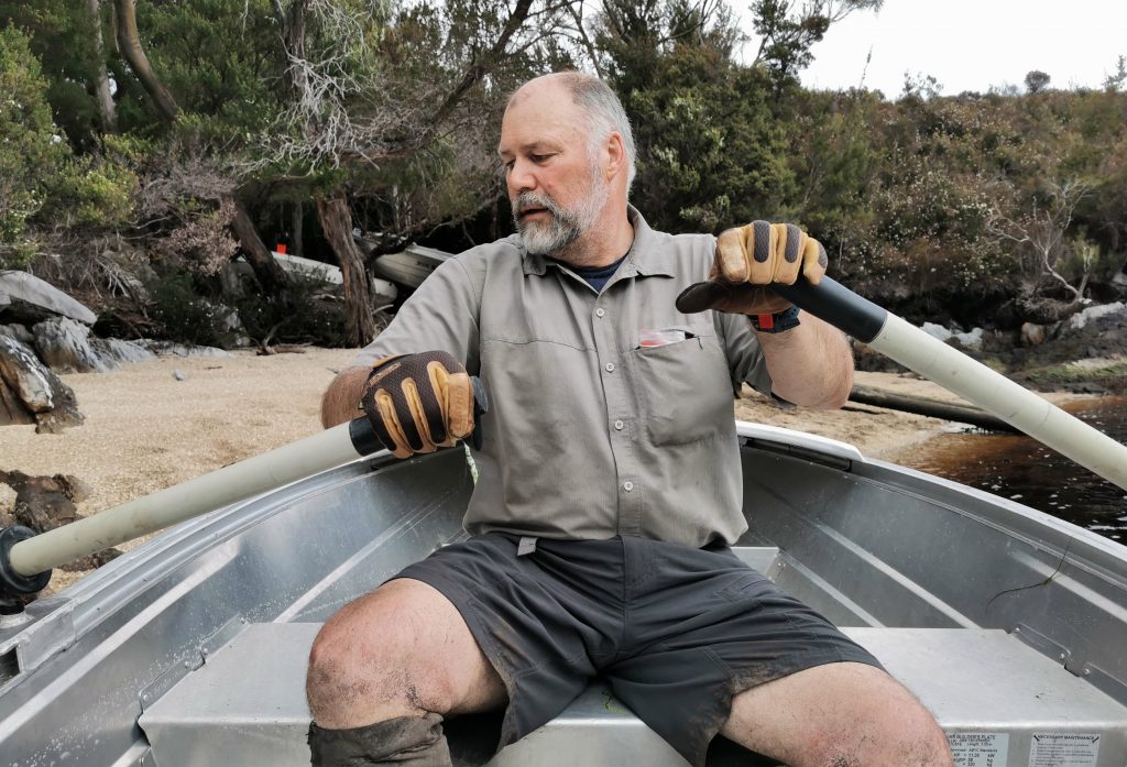 Today we hoped to reach Bathurst Harbour and row across the Narrows, the 400m stretch between Farrell Point and Point Joan. We were fully aware this was a potential place to get held up, as strong currents, winds, and tides often make the crossing treacherous and delay trips on the PDT. We aimed to reach the Narrows by 4 pm, as the fine weather was due to break overnight, and we needed to cross within an hour before or after low tide at 5:30 pm. The track, we knew couldn’t be worse than we had already experienced, now could it?