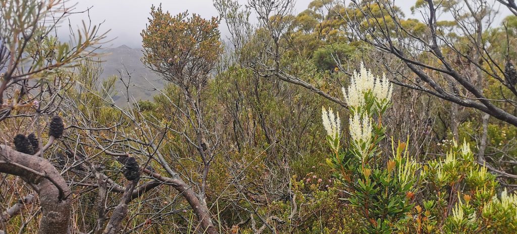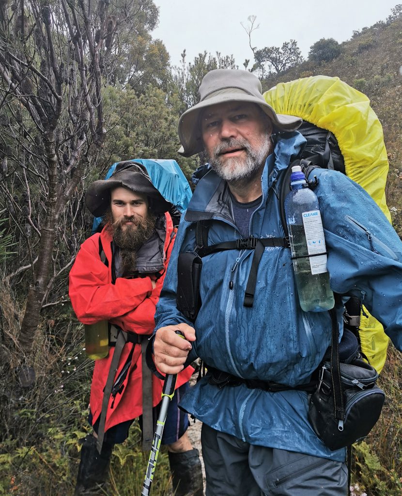 We left soon after 7 am and the other groups (Mark and Glen, a couple of teachers from NSW and a group of 6 friends from Melbourne) were on the track at a similar time. It was 17.6 km to Louisa River, up and over Red Hills, at 236 m elevation, then along forest and plains. It was great fun walking in the rain.