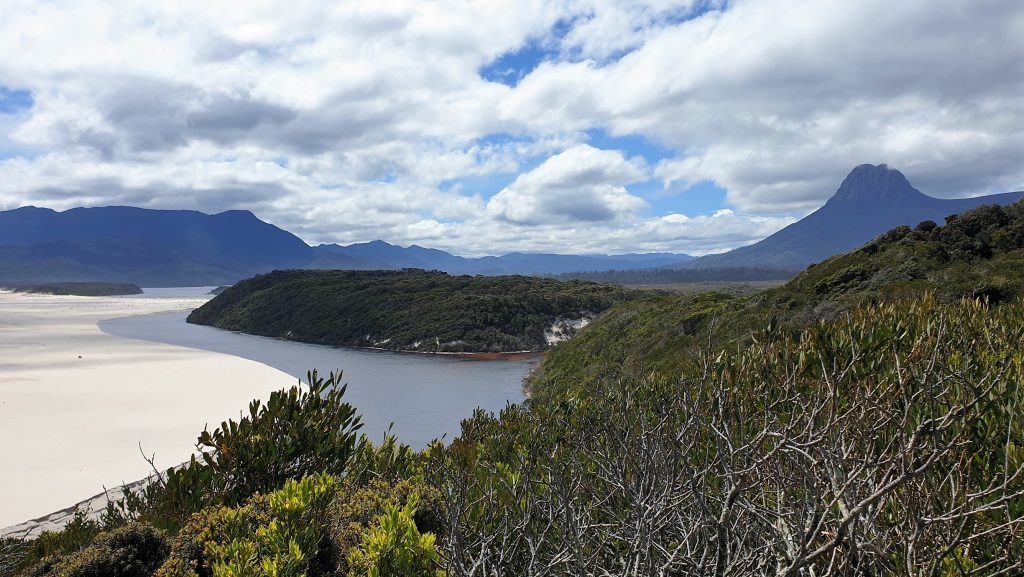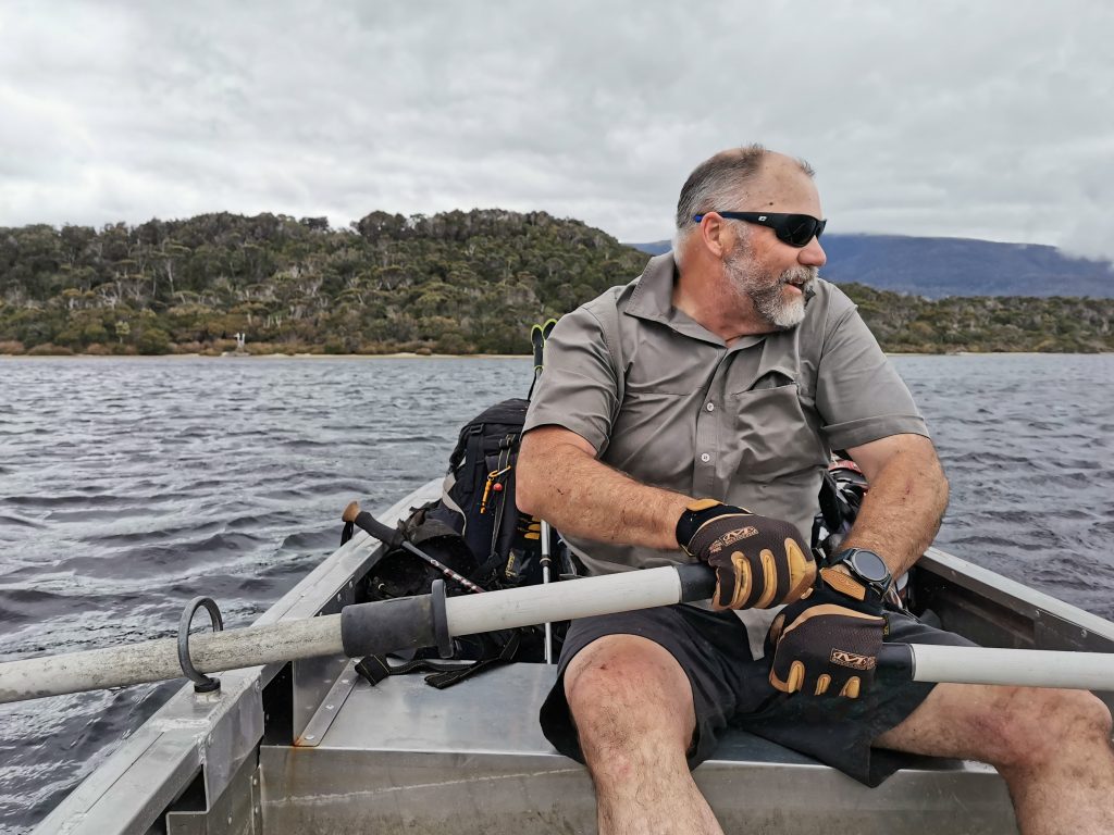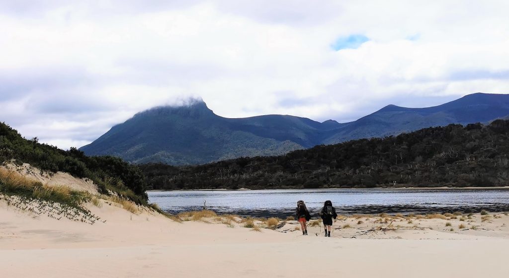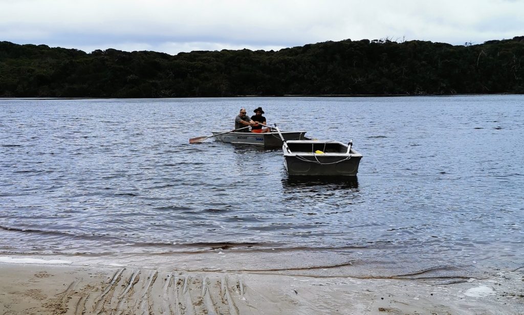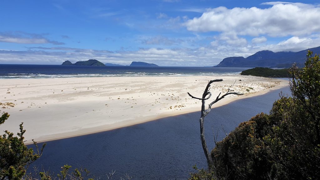 Before long we were striding along Prion Beach, a 4 km beach renowned as one of the most beautiful in Tassie’s south west. It was easy walking at low tide. At the end of Prion Beach is another rowing section. There are warnings not to attempt to cross on foot due to rogue waves and quicksand, so it was time for another 3-way crossing, this time with Justin to share the oars. The dinghy waiting for us had a bent oar, but Tim was still able to get us across without incident. Then both Tim and Justin rowed back, towing boat two and having to synchronise one oar over the other as they were too long to row together. The Trek group arrived at the lagoon as they returned to the western shore, and they brought a couple of Trekkies back on their final trip.