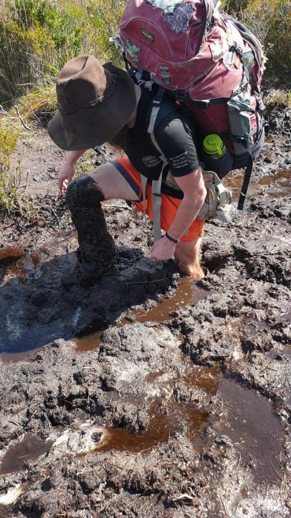 We could have camped at Prion for the night, but again, we were not ready to stop so kept on after blue brie, tomato, cucumber, rice cakes and hot tea. Sounds boring, but we really enjoyed these lunches on our favourite chairs. The next section reminded us of the Port Davey Track as we again hit long sections of deep thick mud. No worries for seasoned muddies like us but not the usual wedding anniversary scenario!