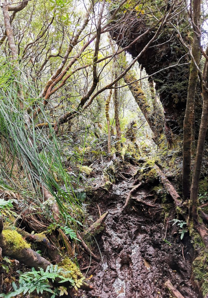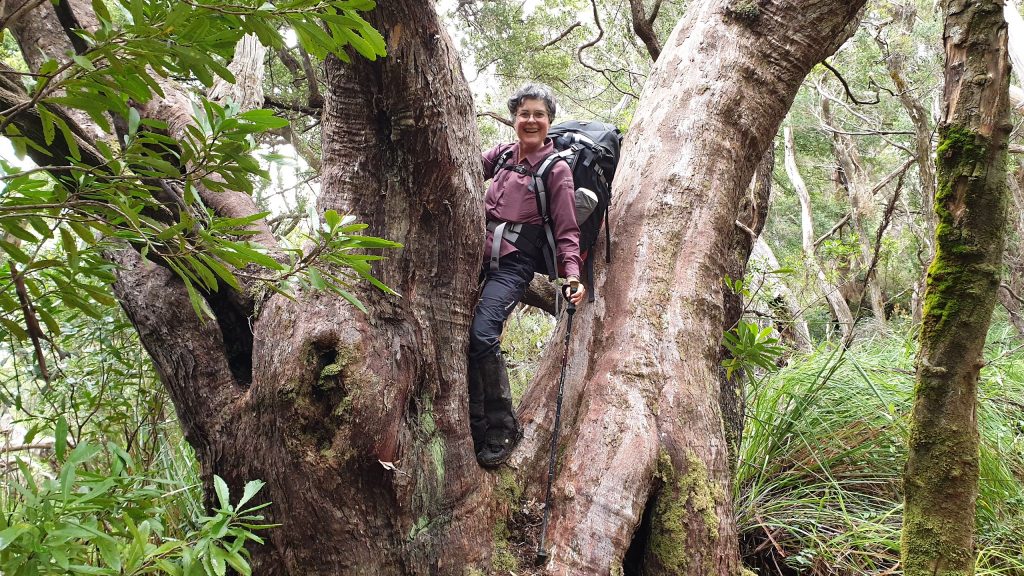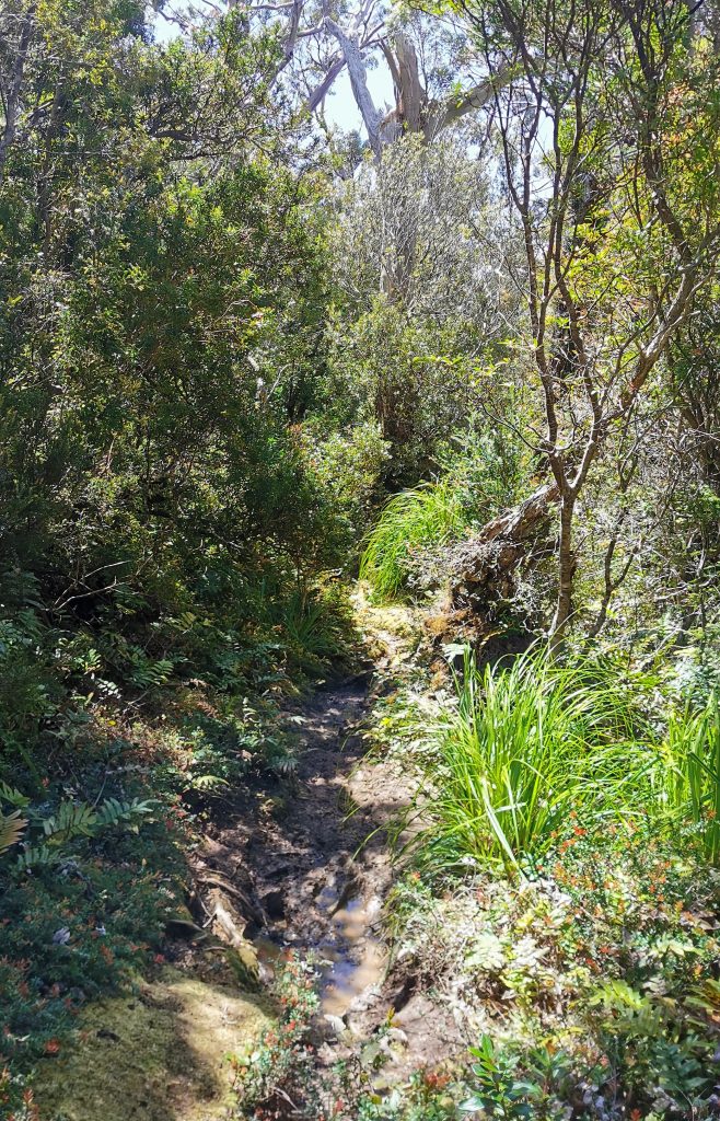 There are 3 major climbs, up to a maximum of 436 m, half the height of the Ironbounds. However, we found the day much easier than we had anticipated. Mud – done it before. The twisted roots were not as bad as the Ironbound descent. Trees to climb over or under – no worries. Our packs were getting lighter and our agility improving.